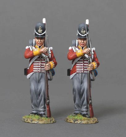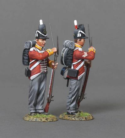 A Corporal and Private quickly reloading after discharging their weapons. 2 Piece set. 60mm metal figures painted in matte finish.
