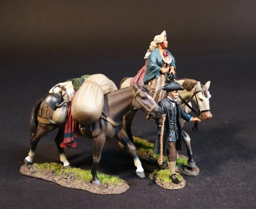 Set consists of and older Gentleman with horses and a young women with a child riding on one. 60mm metal figures painted in Matte finish. 4 Piece set.