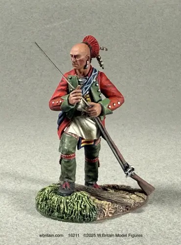 Native warrior with British jacket loading his musket. 1/30th scale white metal painted in matte.