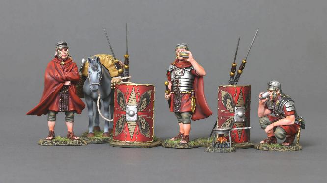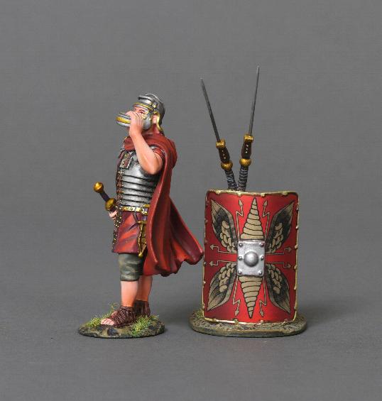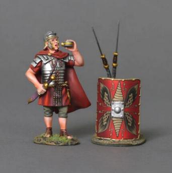 60mm metal figure painted in matte finish. Red shield. Roman soldier wearing cloak and drinking from canteen.. This set includes cloaked soldier and shield with 2 spears.