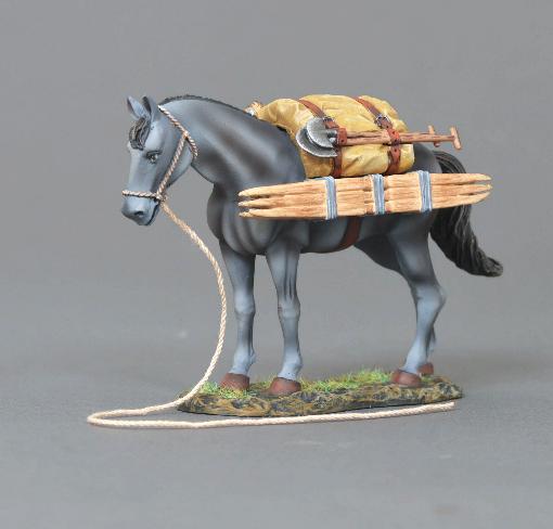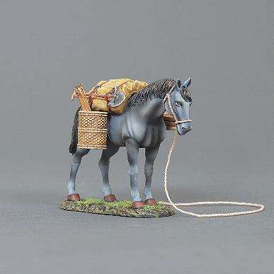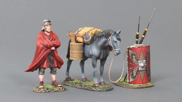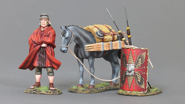 60mm metal figure painted in matte finish. Roman Legionnaire in cloak with pack pony. 3 piece set includes legionnaire, pack pony, standing shiled wtih 2 Pilums.